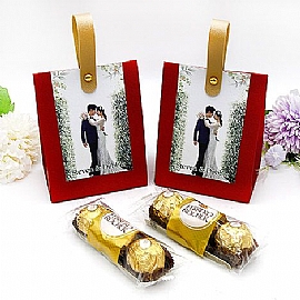 這款客製照片金莎禮盒,將新人婚紗照或喜愛的照片呈現在盒面上,搭配紅色禮盒與金色提把設計,質感與紀念性兼具。