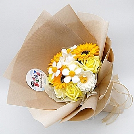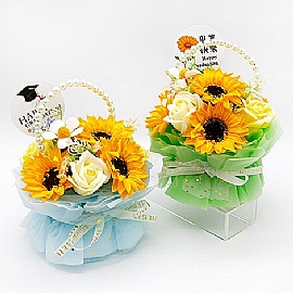 這款畢業向日葵香皂花束,以象徵陽光與希望的向日葵為主角,搭配柔和色系花朵與乾燥花點綴,整體呈現出溫暖又充滿朝氣的氛圍,特別適合在畢業的重要時刻送上滿滿祝福。