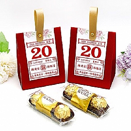 這款中式日曆風格金莎禮盒,以喜氣紅色搭配金色提把設計,結合傳統日曆元素,將婚禮日期與祝福語呈現於盒面,充滿濃厚儀式感與紀念價值。