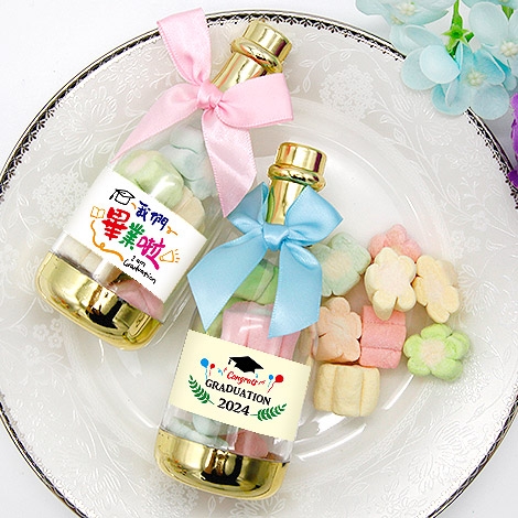 這款畢業小禮物以香檳瓶造型的糖果罐搭配精緻的小花棉花糖,獨具別致的設計讓它成為一份別具心意的禮物。每一朵小花棉花糖都代表著未來的美好開始,象徵著學業的成功和勇敢踏出新的旅程。這份禮物不僅是對畢業生的祝福,也是對他們精彩未來的美好期許。送上這份小禮物,讓畢業生在喜悅和感激中踏上人生新的征程。