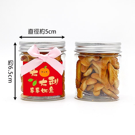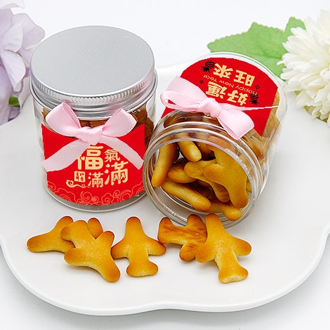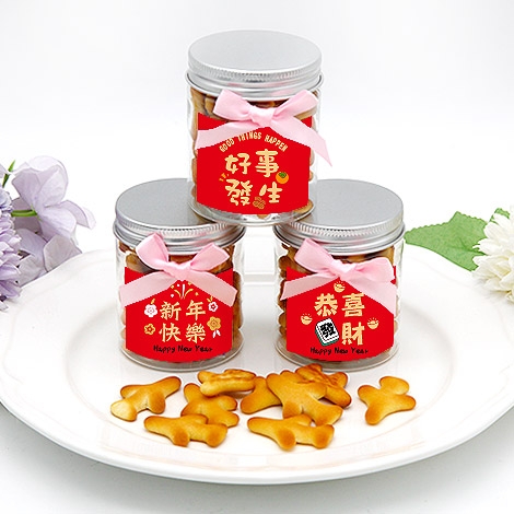 迎接新年的喜悅,就從這個小禮物開始!這款幸福滿罐(新春新年版)不僅內含美味的飛機餅乾,外觀更搭配精心設計的新年祝福貼紙,充滿年節氣氛,讓人一見心情愉悅。每一罐都繫上可愛的緞帶,增添高雅與質感,是送禮與擺設的最佳選擇。