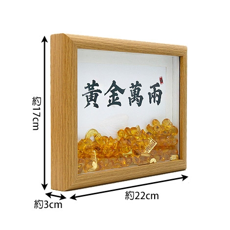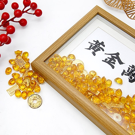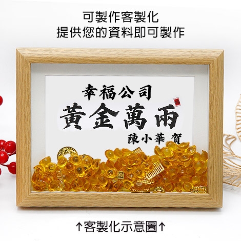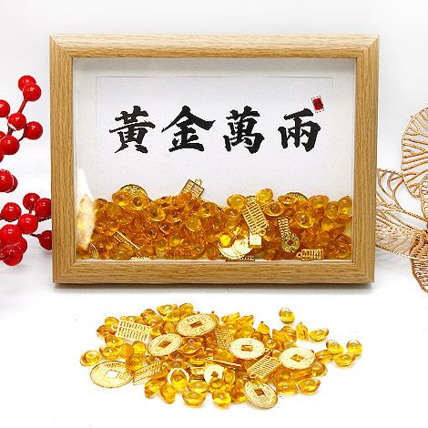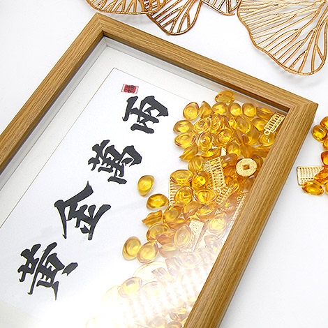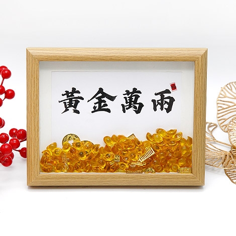 把好運裝進一框金光。「黃金萬兩」書法背卡搭配晶亮小元寶與金幣,輕晃便如財氣湧動,象徵財源廣進、福澤綿延。溫潤木框百搭不張揚,無論置於玄關、櫃檯或辦公桌,皆能為空間增添喜氣與能量。作為招財送禮,送親友、同事或店家都體面到位,把「一路發」的祝願化成每天看得見的好兆頭。