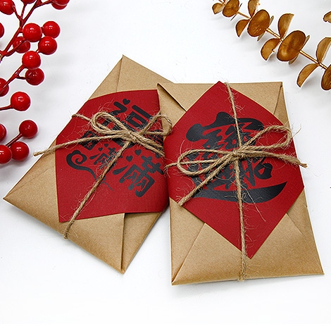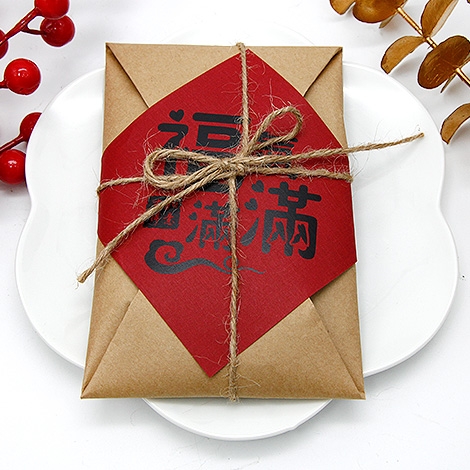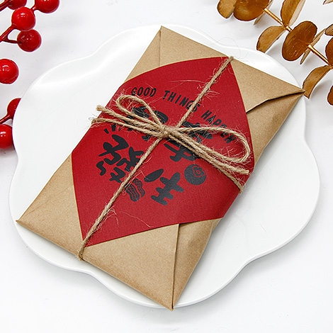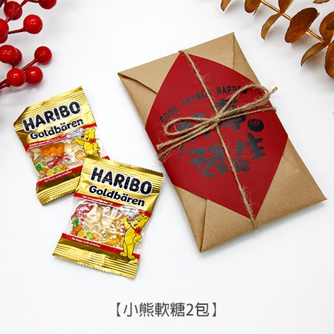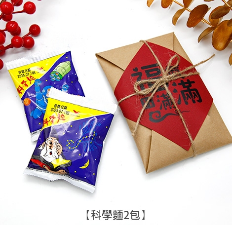 把祝福裝進一封溫度滿滿的小包。霧面牛皮紙摺成古早味信封,系上麻繩,正中貼一張大紅斗方,從視覺就把喜氣鎖住。封面共有「好事發生」、「招財進寶」、「福氣滿滿」三款吉語可挑,無論年節走春、活動致謝、開幕小禮或婚禮送客,都能一份到手、體面好看又很好拍。內裝零食也能自由選擇你想傳遞的風味:經典童年的小王子麵 2 包、霸氣回憶的科學麵 2 包,或是清爽可愛的哈瑞寶小熊軟糖 2 包。一封在手,就把好運、好味與好心情,一次送到對方手心裡。