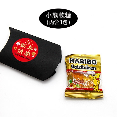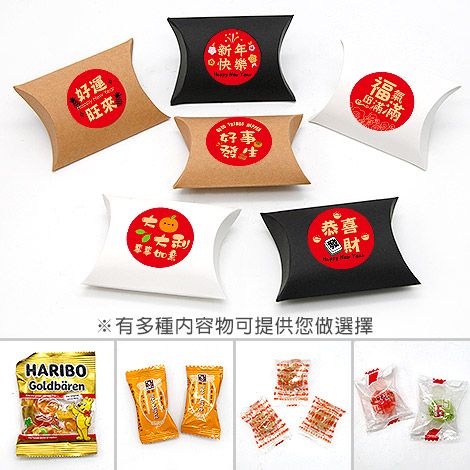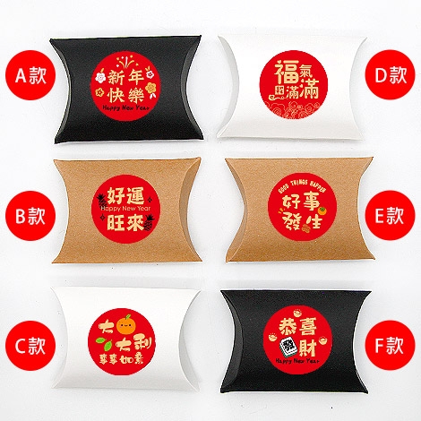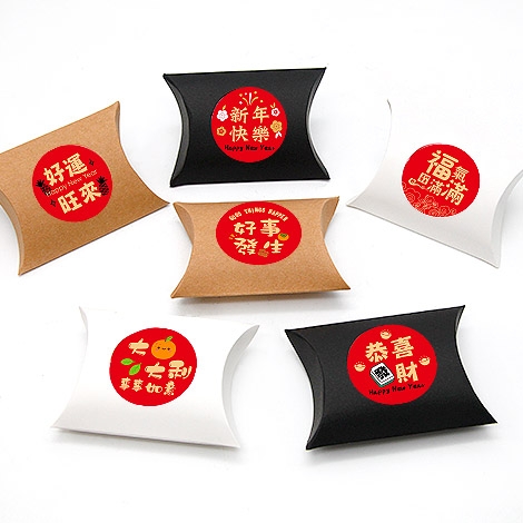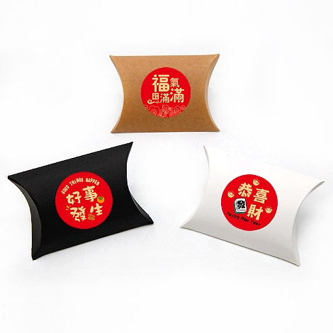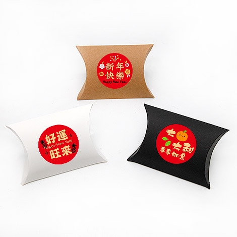 喜氣滿滿的春節喜糖盒,採用枕型盒彩盒設計,外型簡約可愛,搭配新年吉祥圓貼,如「新年快樂」、「恭喜發財」、「福氣滿滿」等字樣,年味十足。