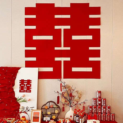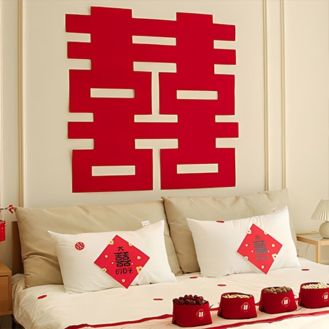 大紅色「囍」字設計,象徵雙喜臨門、百年好合,視覺醒目大方,能瞬間營造出濃厚的婚禮喜慶氛圍。超大尺寸設計,不論張貼於婚房牆面、床頭背板、迎娶場地、宴客會場或拍照背景牆,都能成為視覺焦點,提升整體佈置質感。