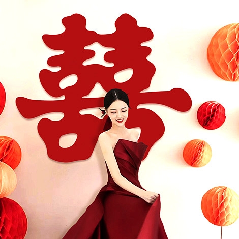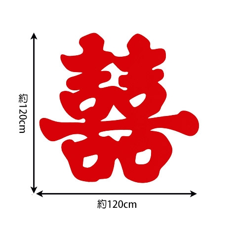 以大紅色立體囍字造型呈現,尺寸醒目,整體比例大方,能輕鬆成為婚禮空間中的視覺主角,象徵雙喜臨門、百年好合,營造濃厚喜慶的中式婚禮氛圍。