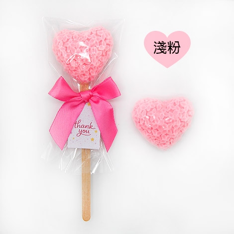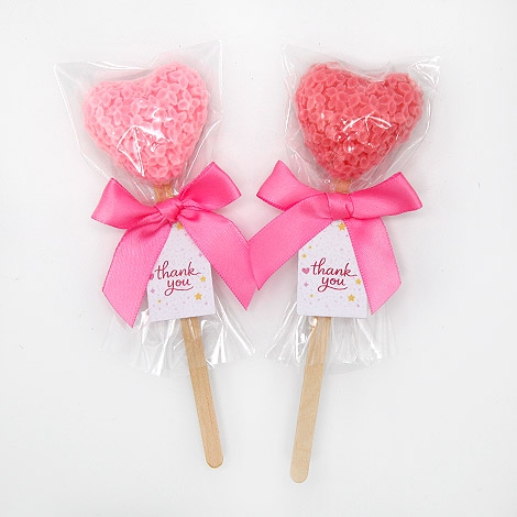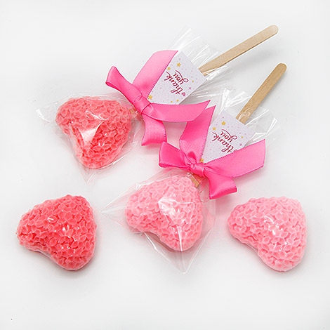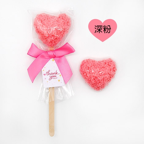 將花朵愛心手工香皂結合木棒造型,打造出俏皮又吸睛的棒棒糖風格,粉嫩色系搭配蝴蝶結與「Thank you」小卡,整體甜美又充滿送禮儀式感。