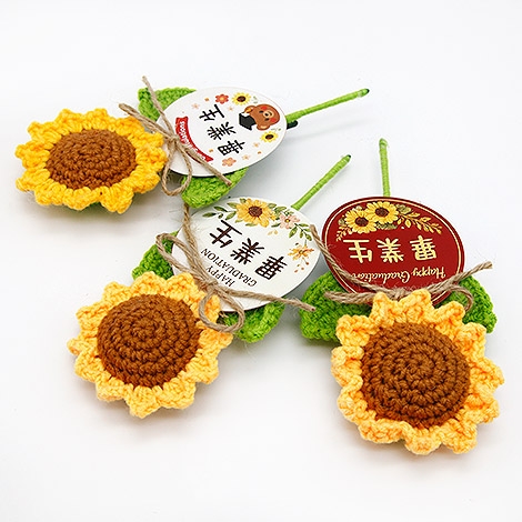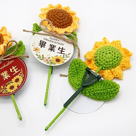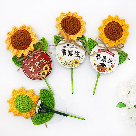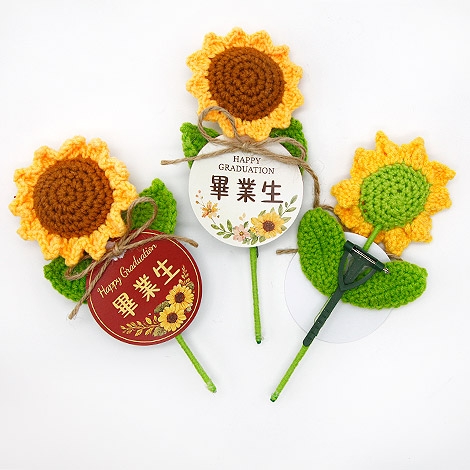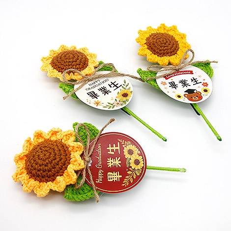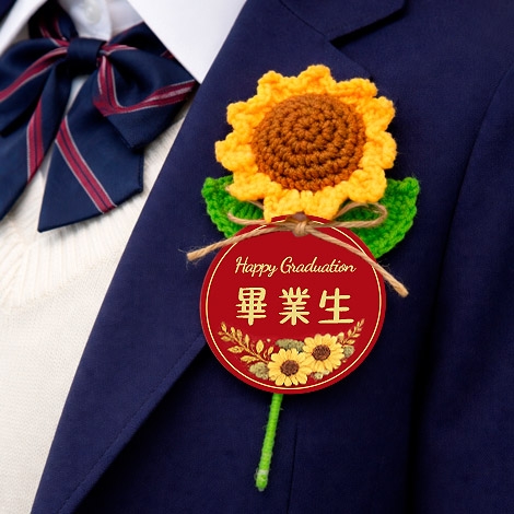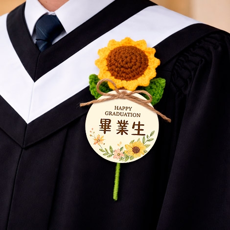 把畢業的回憶,變成一份可愛又溫暖的紀念。圓形名牌搭配療癒系向日葵設計,象徵「圓滿、祝福與希望」,為畢業時刻留下最剛好的溫柔印記。手工編織花朵細節滿滿,搭配自然風設計元素,整體更顯活潑與親切感。