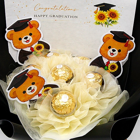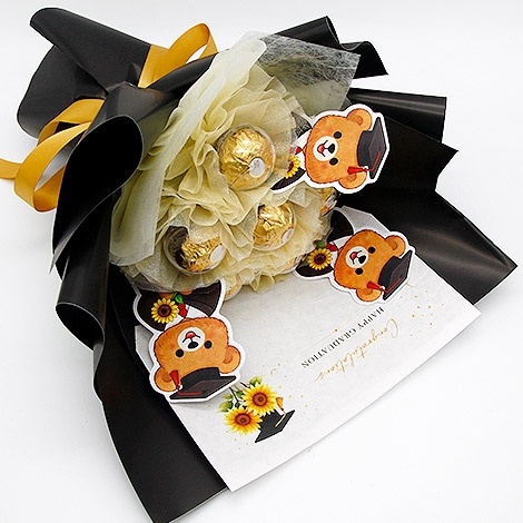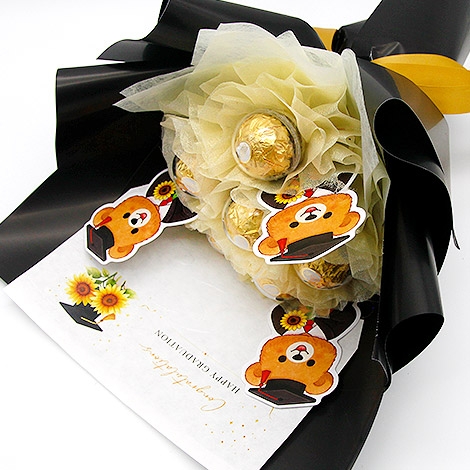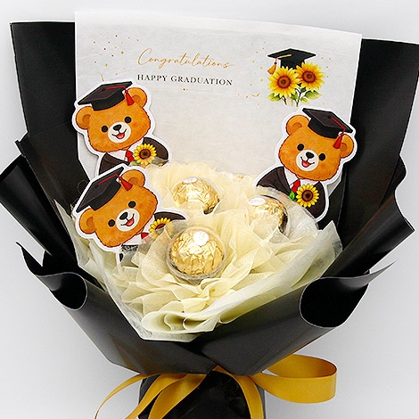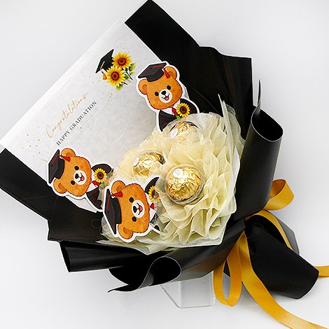花束內搭配3顆金沙巧克力,金色包裝點綴其中,不僅提升整體質感,也寓意著閃閃發光的未來與滿滿祝福。結合精緻包裝與立體小熊卡片設計,無論是拍照打卡或現場送禮,都能成為最吸睛的焦點。