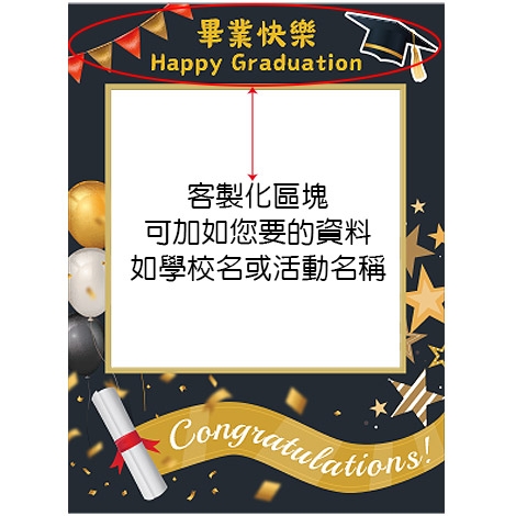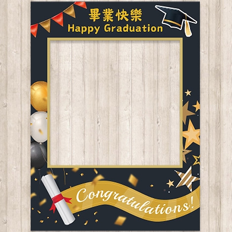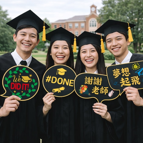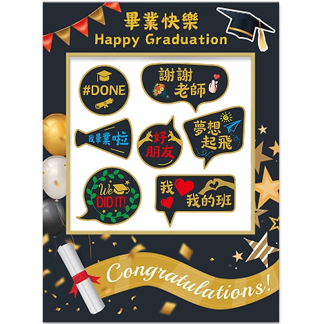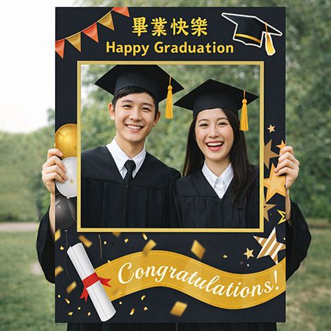 拍照框設計結合「Happy Graduation」與畢業元素,畫面更集中、更有主題感;搭配多款趣味手拿牌,如「我畢業啦」、「謝謝老師」、「We DID IT」、「夢想起飛」等,讓每張照片都更有故事與情緒。
