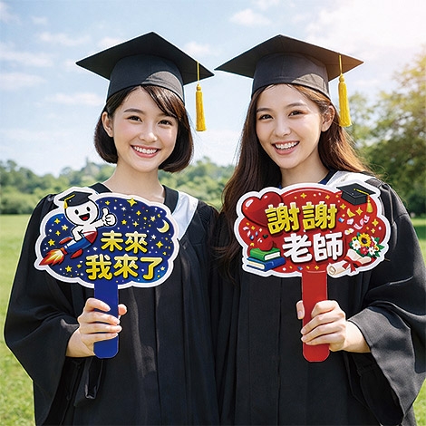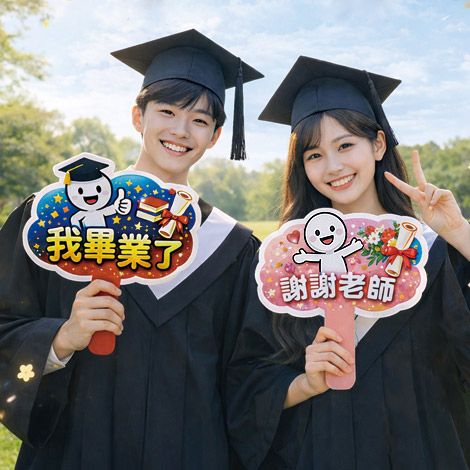讓畢業照不只是合影,而是充滿笑聲與回憶的精彩瞬間!多款趣味手拿牌設計,包含「我畢業了」、「謝謝老師」、「未來我來了」、「終於解脫了」等熱門畢業金句,輕鬆拍出專屬風格的畢業照。
