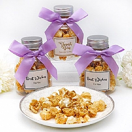 把謝意裝進一罐脆甜的幸福。圓潤透明罐盛裝香氣四溢的爆米花,鋁蓋密封保鮮,系上你喜歡的蝴蝶結六色(粉、橙、紅、紫、藍、綠)之一,氣質立現;正面標籤可於 Thank You 或 Best Wishes 之